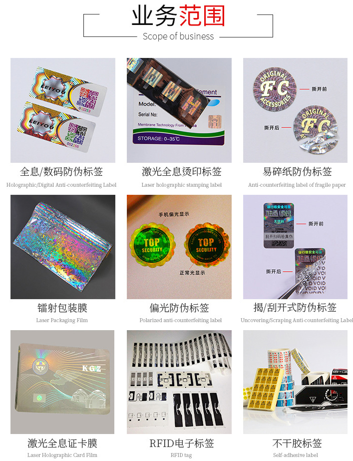 公司拥有先进的生产设备,及优秀技术工程师和专业的服务团队,专注于为各行业提供产品防伪防窜货,溯源营销等解决方案,全息烫印防伪标签,各类油墨防伪标签,全息证卡膜,RFID电子标签等,成功将防伪、包装、印刷各种技术,完美结合,期待与您的合作!